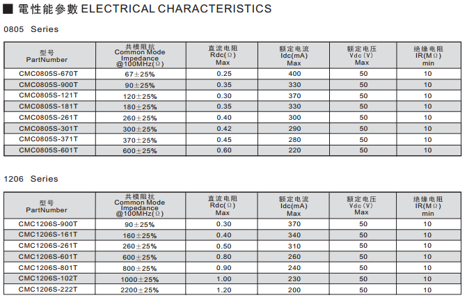 产品名称:风华贴片共模电感 CMC1206S-801T